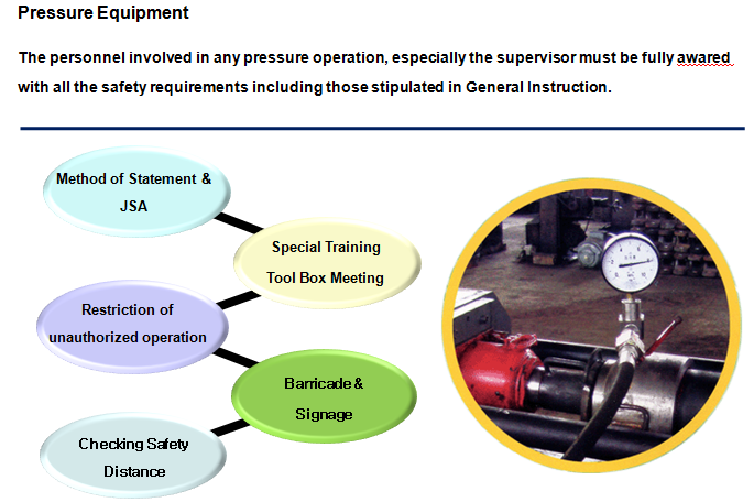 The personnel involved in any pressure operation, especially the supervisor must be fully awared with alll the safety requirements including those stipulated in General Instruction