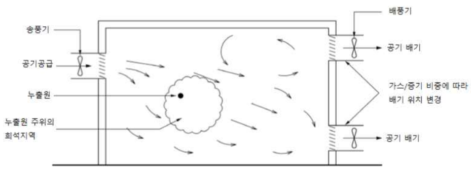 - 대상 환기가 주어진 누출원의 가스 또는 증기를 희석시키는 룸 전체 또는 넓은 공간의 일부의 밀폐공간