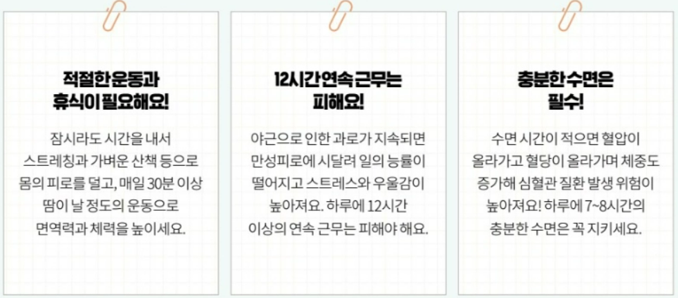 피로로 인한 건강영향이 생기지 않도록 근로자들의 적절한 건강관리, 치료 등의 적극적인 관리가 필요하다.