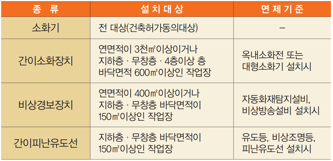 소화기, 간이소화장치, 비상경보장치, 간이피난유도선으로써 화재위험이 있는 건축공사 현장에 임시소방시설 설치 의무화