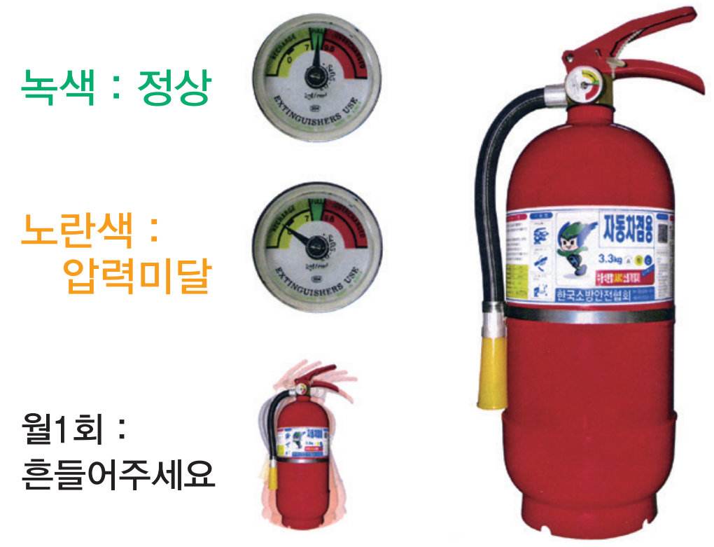 - 압력계 지침이 녹색을 가리키면 정상, 노랑색이면 압력 미달