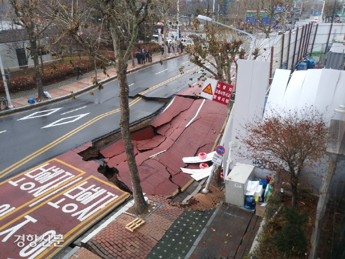 그리고 10분정도 후 암 일부가 무너져 공사현장 밖 도로가 내려앉고 뉴스 속보로 이어졌습니다.