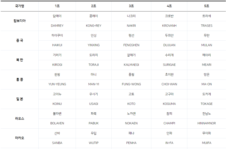 태풍 이름은 각 국가별로 10개씩 제출한 총 140개가 각 조 28개씩 5개조로 구성되고, 1조부터 5조까지 순차적으로 사용한다. 140개를 모두 사용하고 나면 1번부터 다시 사용한다. 태풍이 보통 연간 약 25개 정도 발생하므로 전체의 이름이 다 사용되려면 약 4∼5년이 소요된다. 태풍위원회 회원국에는 북한도 포함되어 있어 한글로 된 태풍 이름은 20개이다.