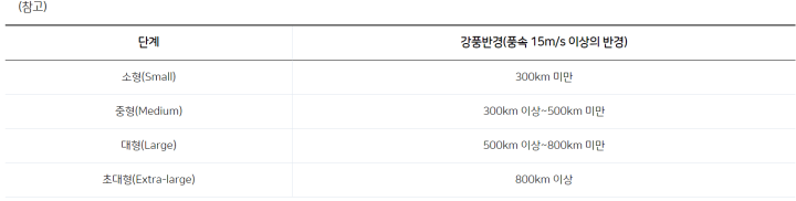 태풍의 크기는 강풍반경을 기준으로 구분하였으나, 태풍정보서비스 개선에 따라 2020.5.15. 이후 크기 분류 대신 강풍반경과 폭풍반경 정보로 제공한다.