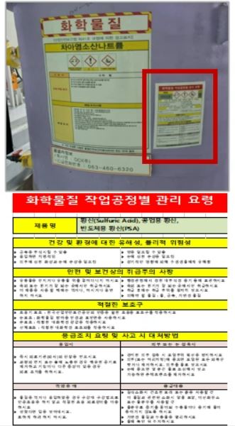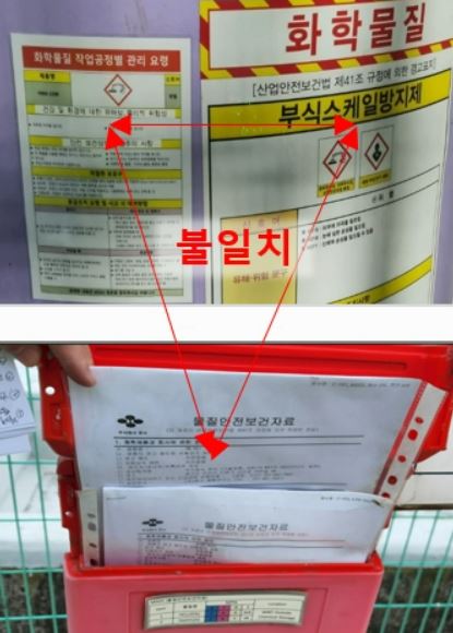 MSDS-경고표지-작업공정별 관리요령 간 정보가 불일치 하는 경우입니다. 처음부터 불일치하는 상태로 부착이 되었거나, MDSD가 업데이트 되었음에도 현장 부착된 경고표지/작업공정별 관리요령이 업데이트 되지 않은 상황 등에서 자주 발생됩니다. 표지판/게시물의 특성상 현장 곳곳에서 눈에 잘 띄기 때문에 지도감독의 대상이 되기 쉽고, 작업자분들에게도 올바른 물질 정보를 제공하는 측면에서 주기적인 관리가 필요합니다. 화학물질 월간 점검 시 체크리스트에 반영 또는 관리감독자 점검 등을 통한 주기적으로 점검/관리가 필요합니다. |