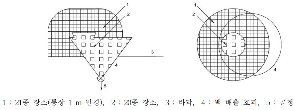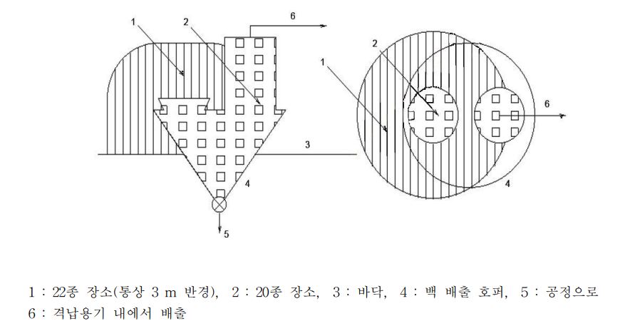 (2) 21종 장소 : 드럼마개와 호퍼뚜껑이 열리고 호퍼 상부의 다이어프램 밸브를 달거나 철거할 때 분진누출이 분출운 형태를 발생시킨다. 따라서 21종 장소는 드럼, 호퍼상부 및 다이어프램 밸브 주위 1 m로 하되, 이를 바닥까지 연장한다.