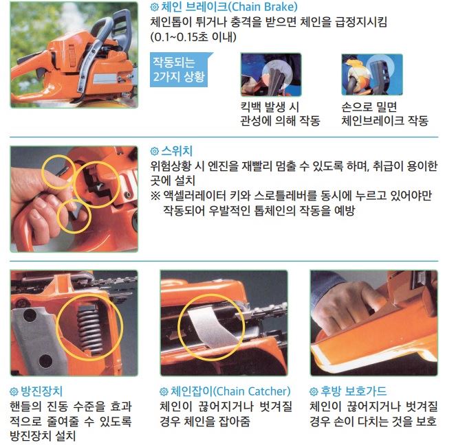 기계톱을 사용하기 전 안전장치 작동 상태를 반드시 확인하도록 한다.