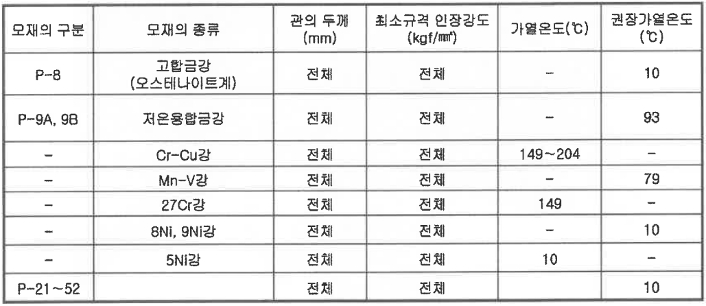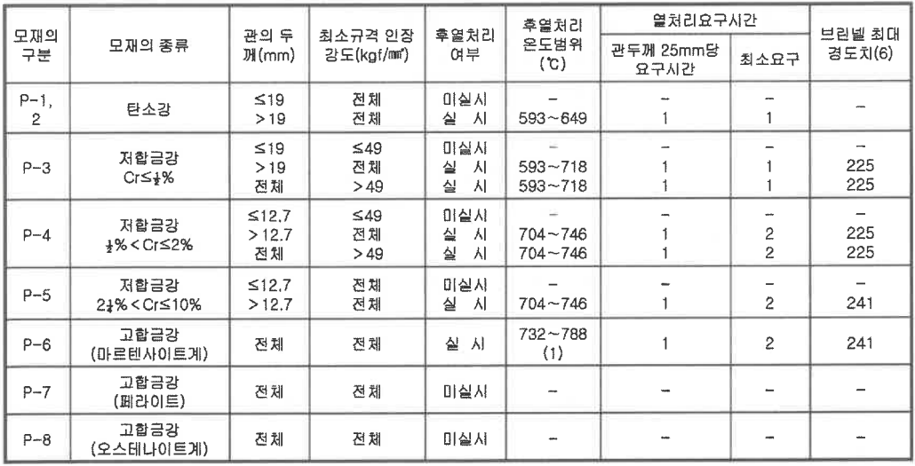 주 1) ASTM A 240, Gr.429에 상응하는 재질은 621~663℃의 온도범위에서 후열처리 하여야 한다.