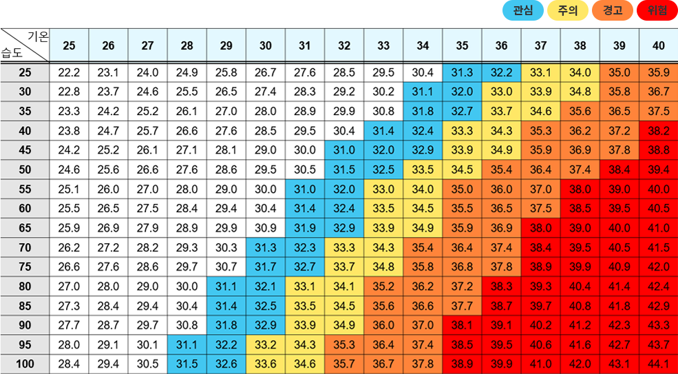 - 예: 33℃의 기온에 습도가 80% 이상이면 체감온도는 40℃ 이상이 될 수 있음