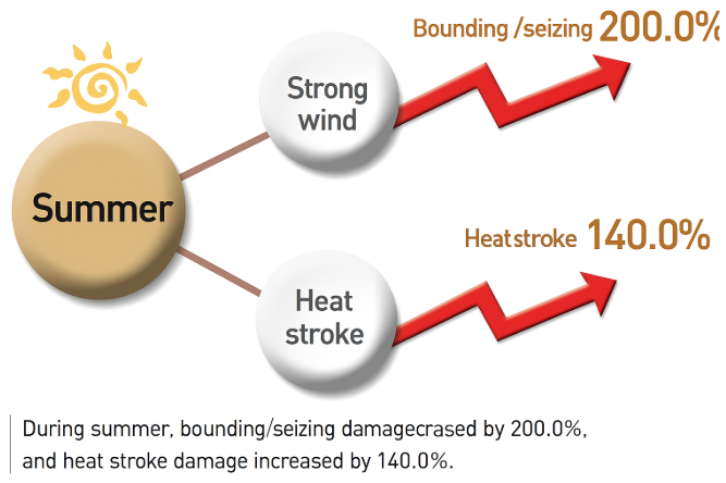 뇌·심혈관질환은 월평균 발생 재해자 수 99명에 비해 일교차가 큰 3월에 월평균 110명이 발생하여 계절적 추이를 나타내고 있다. 또 감김·끼임 사고로 인한 재해자 또한 월평균 1,407명에 비해 춘곤증세가 높은 3월에 월평균 1,492명이 발생, 가장 많은것으로 나타났다.
